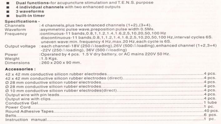 New, improved, portable acupunctoscope model AWQ-104B, with four outputs, treats 8 acupoints simultaneously. New IC circuitry, no cross over. Polarity reversal switch for each channel and battery low indicator Acupuncture point detector High/low voltage switch: low for needles, high for TENS. 3 pulse forms: Continuous, intermittent and dense-disperse wave forms Two frequency range settings: 0 to 100 Hz and 0 to 1000 Hz Improved alligator clip wires, 9 V battery and detection probe included Sturdy artificial leather carrying case included